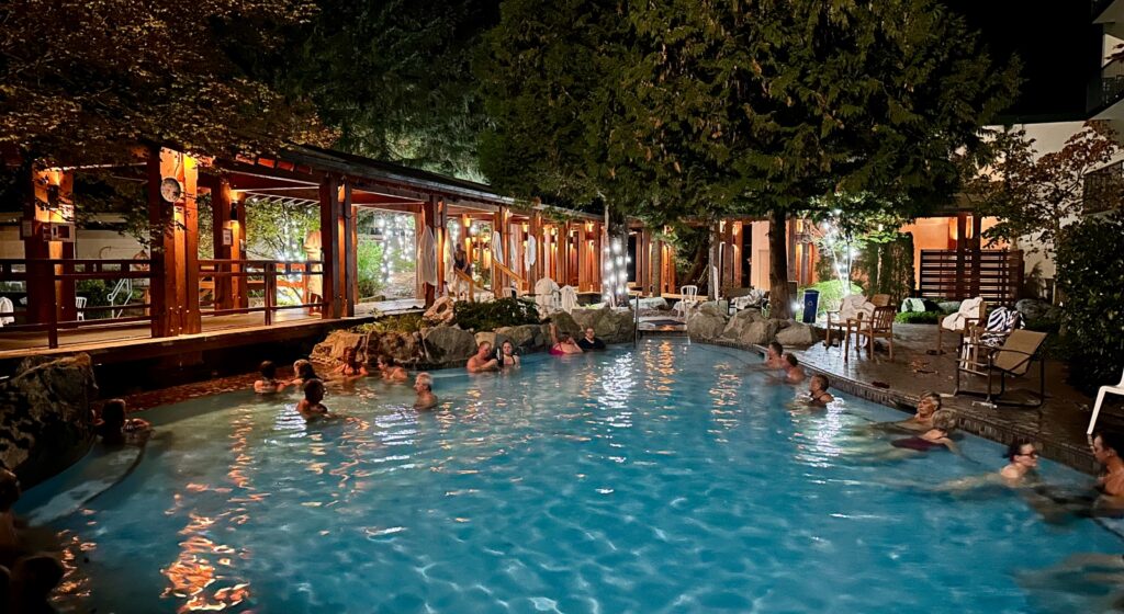 The Resort Hotel has five hot minerals springs pools of varying shape, size and temperature. I know. I tried them all. And one can’t help but feel important sauntering past a roaring fire in the lobby clad in a cozy bathrobe and slippers before slipping al fresco into the soothing waters.