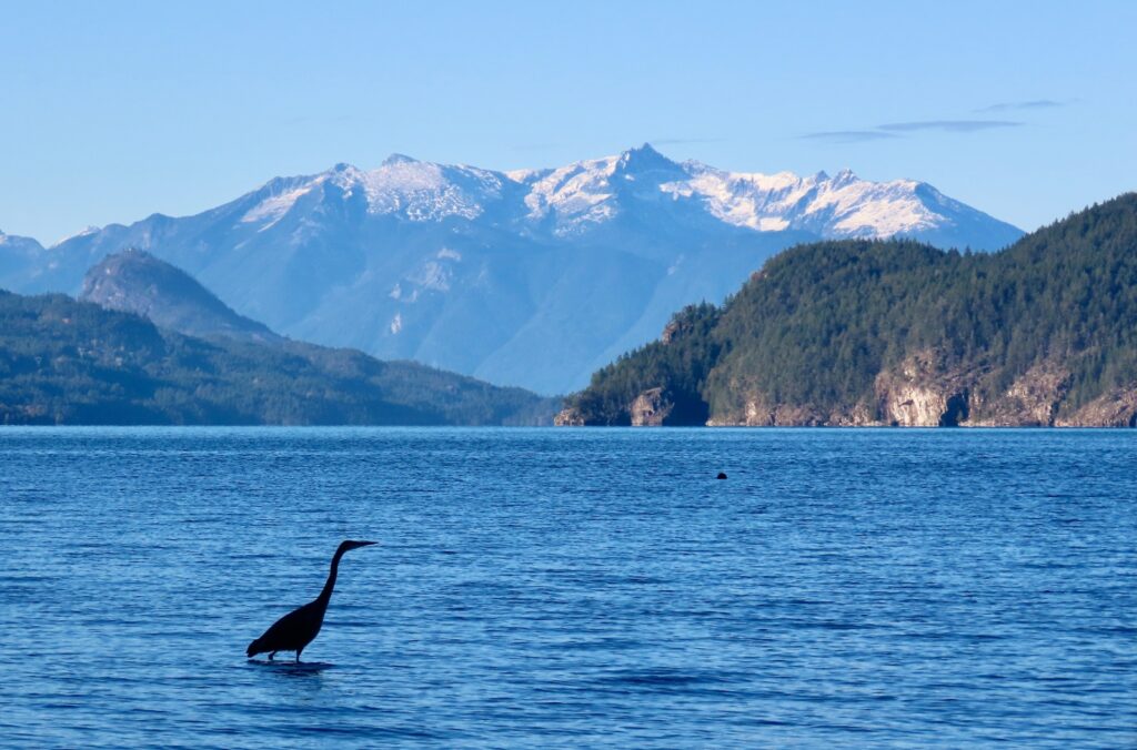 With an afternoon flight home the next day—and just a short commute to the airport—I had time to explore before hitting the highway. I walked the lakeshore and found the spot where the hot springs originate, a trickle of ochre bubbling out of the dark forest canopy. Out on the lake a great blue heron stalked minnows in the shallows while a harbour seal looked on enviously. Framed by the distant snowy peaks, the pair offered a fine portrait.
